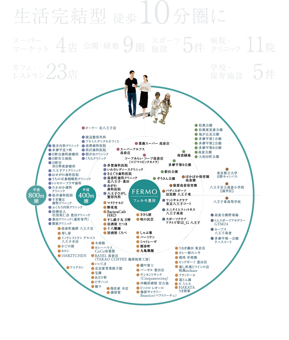 ※徒歩圏エリア概念図は、現地を起点とした半径約800m圏にある施設を直線距離に基づき配置したイメージ図で、施設の位置関係・距離は実際とは異なります。また、周辺環境は将来にわたって保証されるものではありません。