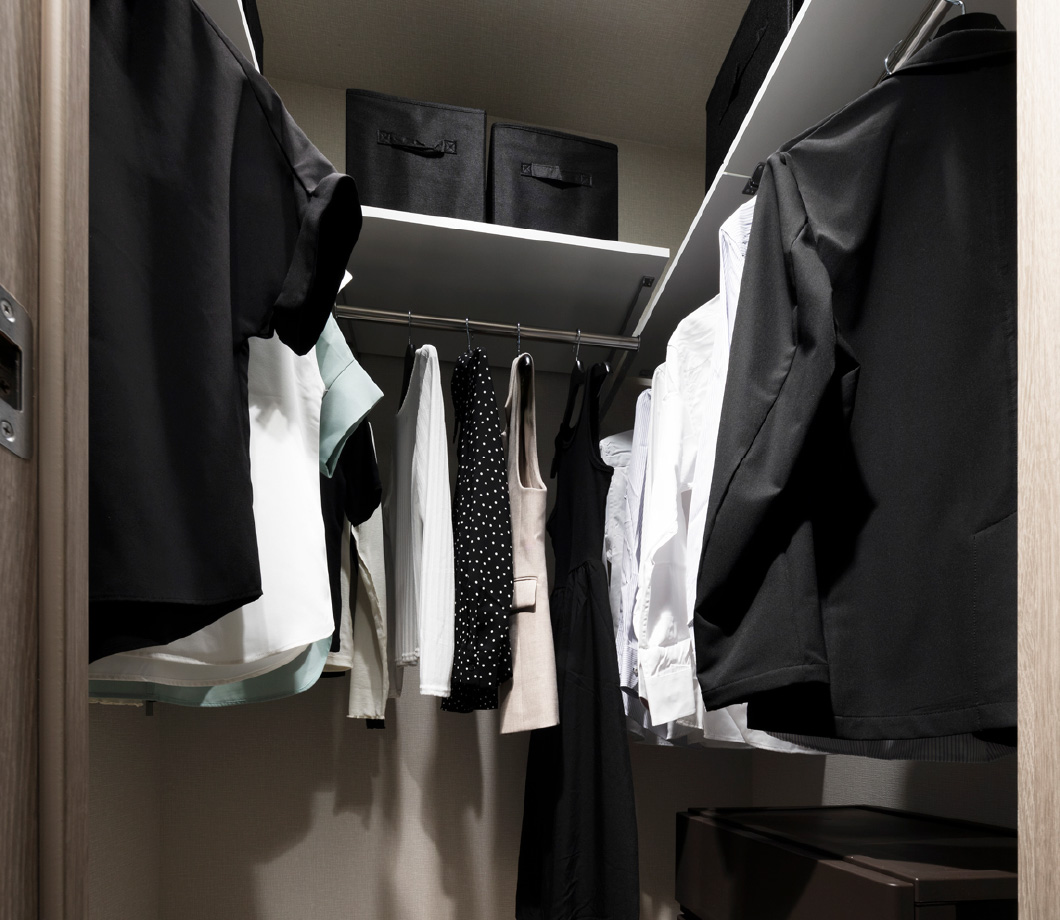 衣類収納に便利なハンガーバーを標準装備し、スーツケースもしまえる大容量収納や、奥行きを確保した布団収納のあるプランもご用意。